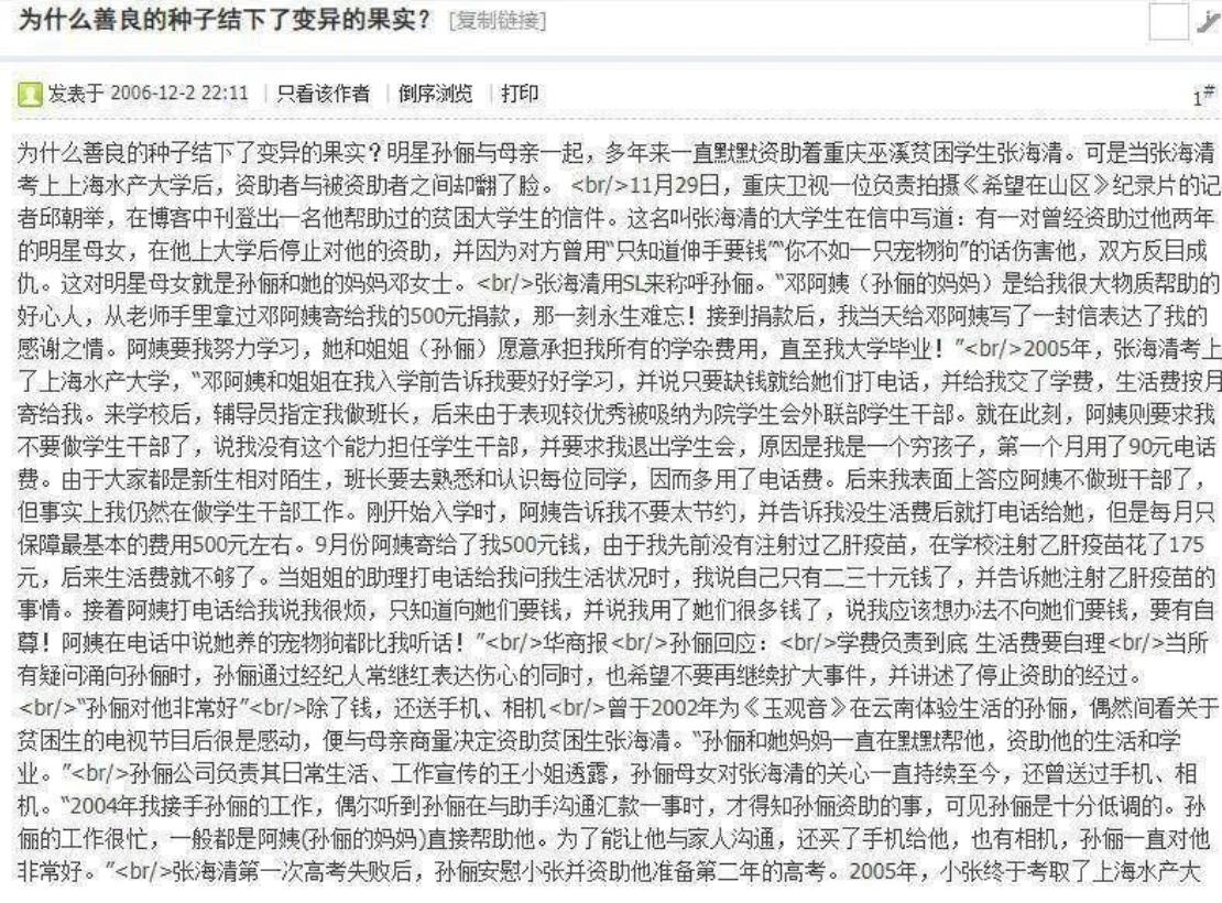 可誰曾想,後來不再受到資助的向海清發了一篇6000字的長文“指責”孫儷和母親,瞬間引發了巨大的爭議。