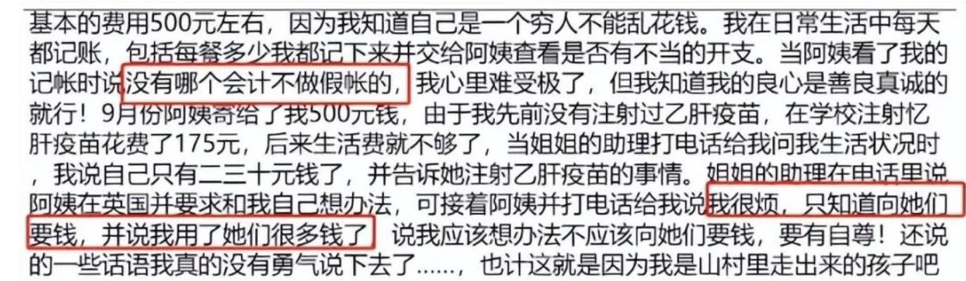 文章中,向海洋一直講述着自己家庭的貧困和所受的種種委屈,並“指責”和“挖苦”孫儷母女是“小雞肚腸”和欺負了他。