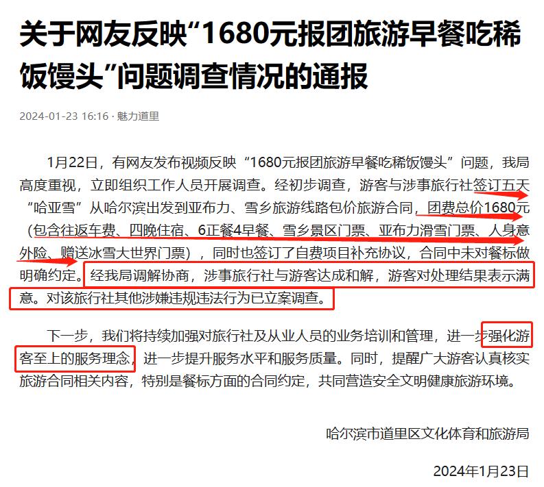 1680元報團旅遊喫稀飯饅頭後續,哈爾濱回應了,旅行社悔不當初!