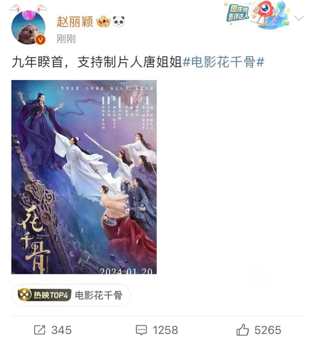 就連曾出演電視劇版《花千骨》的趙麗穎在社交平臺發文,表示支持製片人唐姐姐,並曬出電影《花千骨》的宣傳海報。