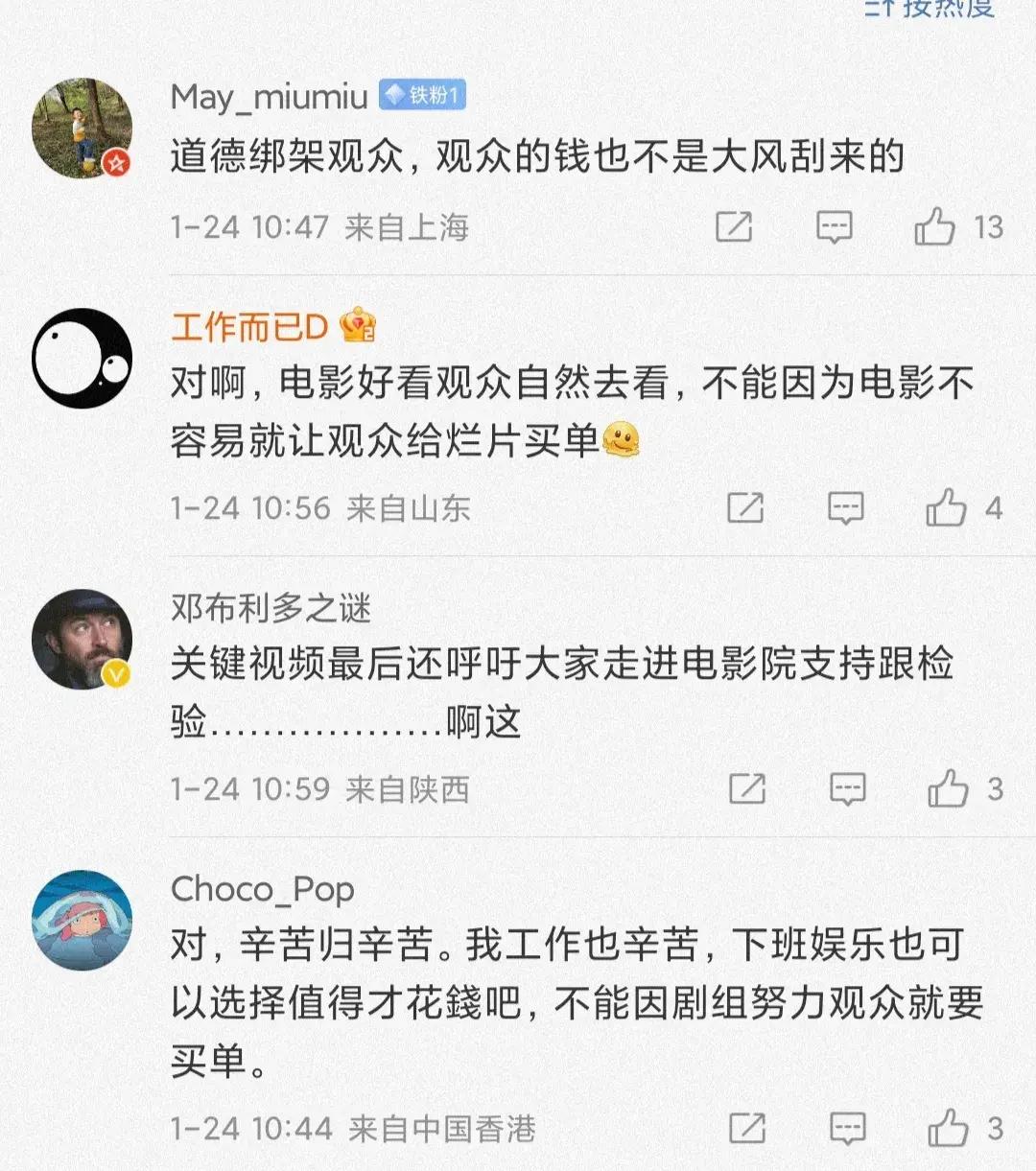 還道德綁架觀衆,電影好看大家自然會看,演員拍戲確實辛苦,可誰工作不辛苦,作品質量是關鍵,否則,賣慘也沒用。