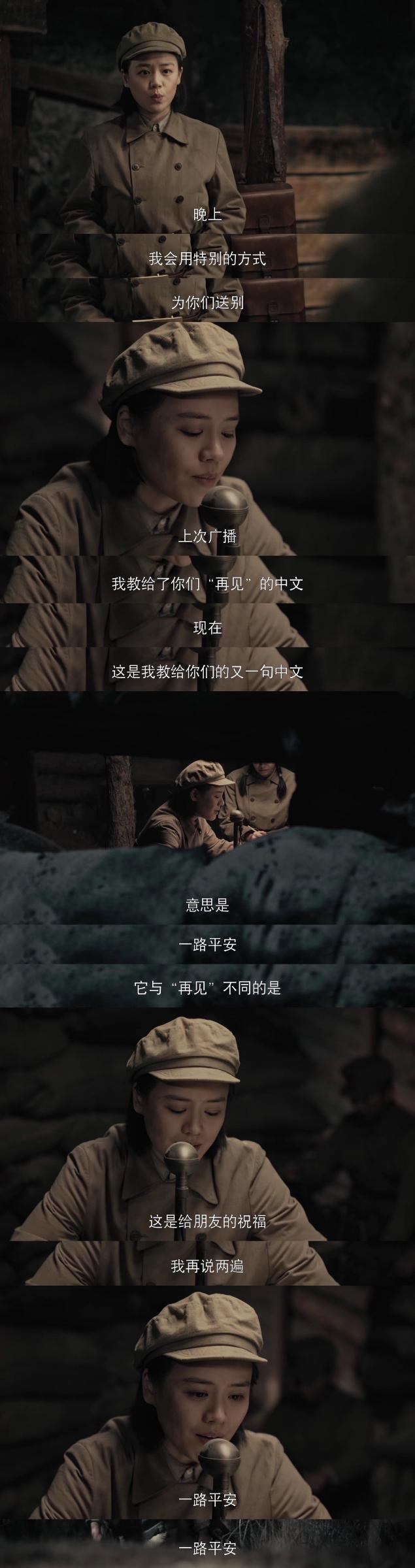 這句“一路平安”,一方面這是戰略:因爲她相信,無論身處何種立場,人的內心都有對和平和生命的渴望,因此作爲敵工科的一員,在對敵人進行廣播宣傳的時候,她選擇攻心爲上。