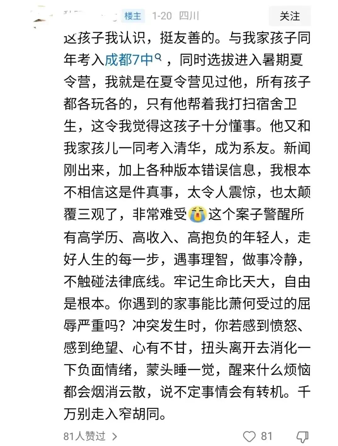 陳立人一位同學的媽媽則說陳立人非常友善,她說她的孩子和陳立人同年考入成都七中,後來又一起考入清華大學。