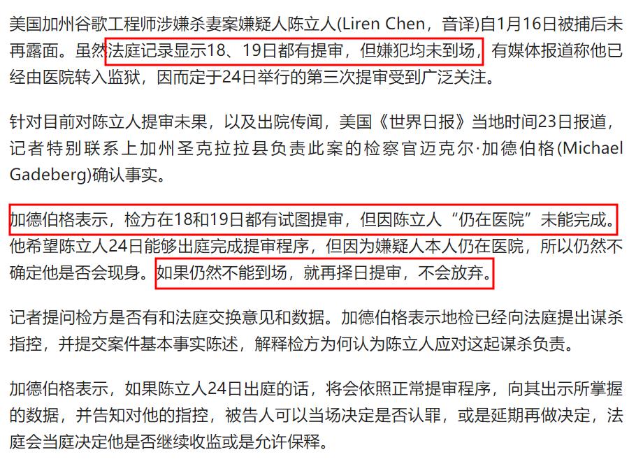 1月23日,當地負責此案的檢察官邁克爾·加德伯格表示陳立人仍在醫院,媒體報道不實。