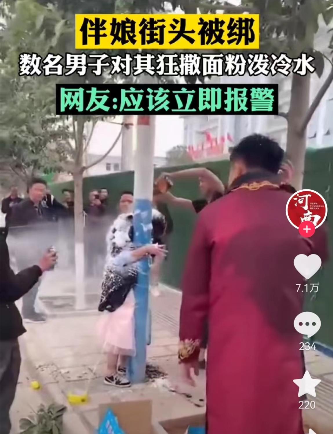 比如伴娘街頭被綁,數名男子對其狂撒麪粉潑冷水。