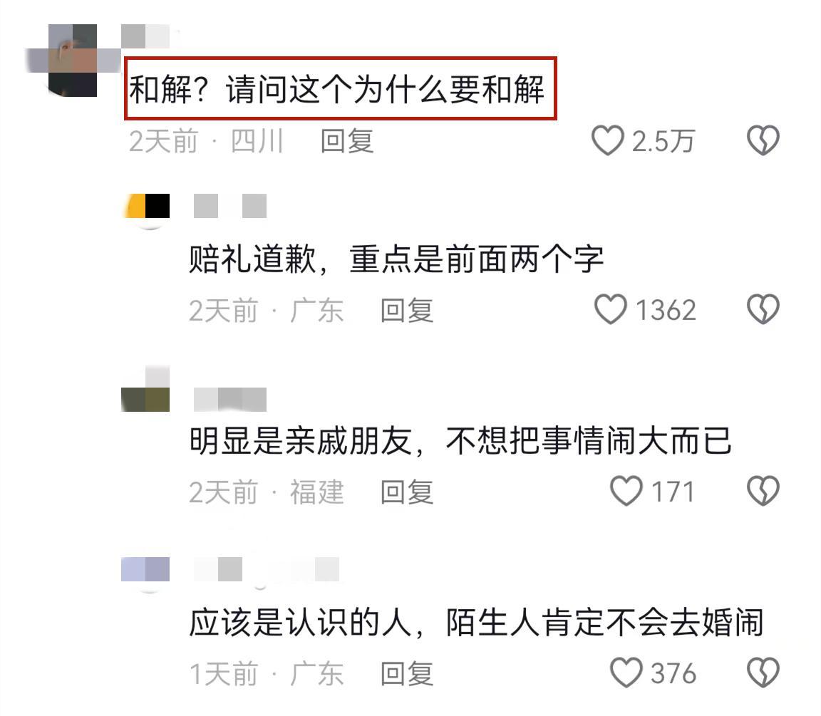 對於和解的原因,新娘發文進行了回應,她說婚鬧的是3個人,都是新郎認識的人,在報警溝通之後,這3人已經向她道歉。