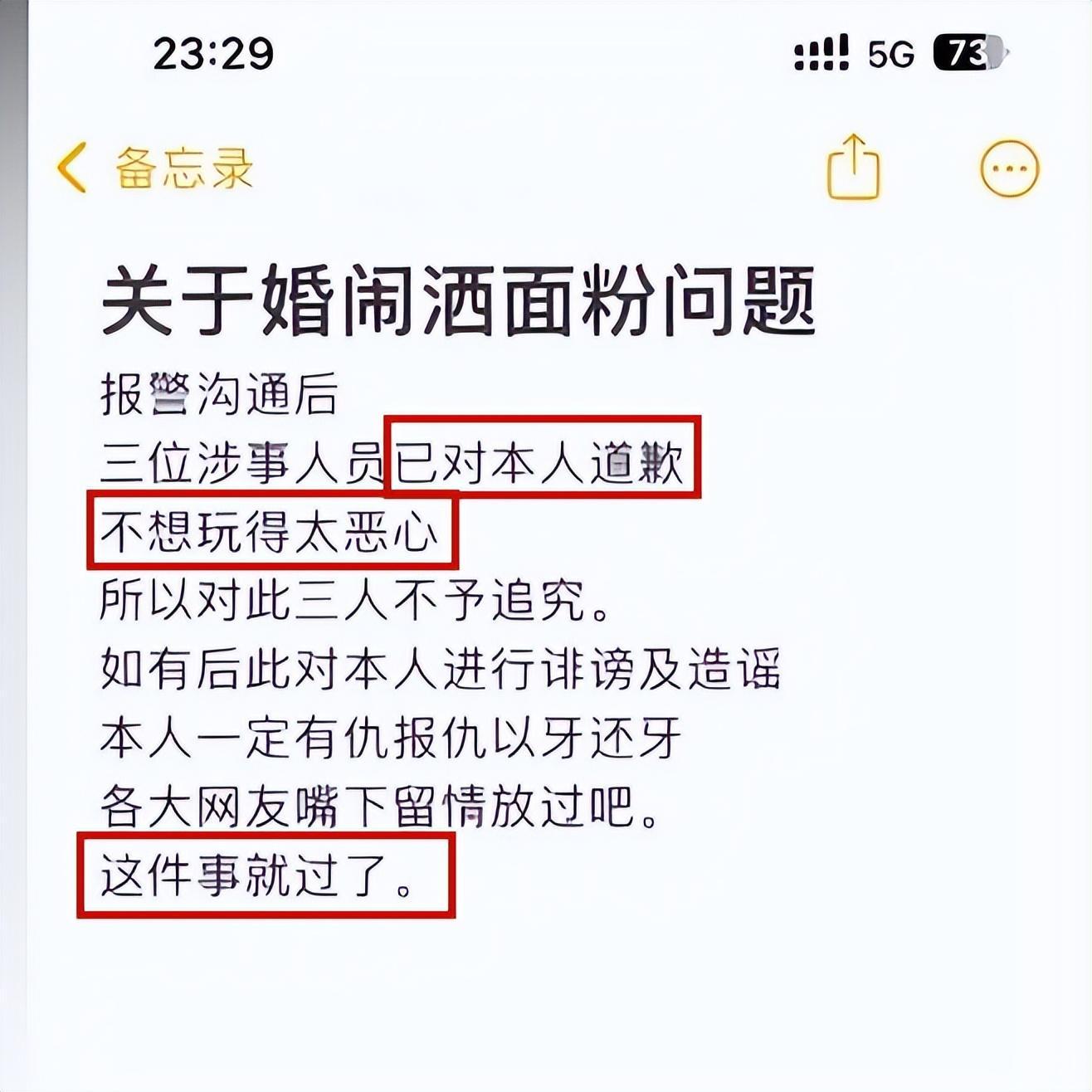 新娘還曬出了其中一人的手寫道歉信,新娘說到此爲止,這件事情就過了。