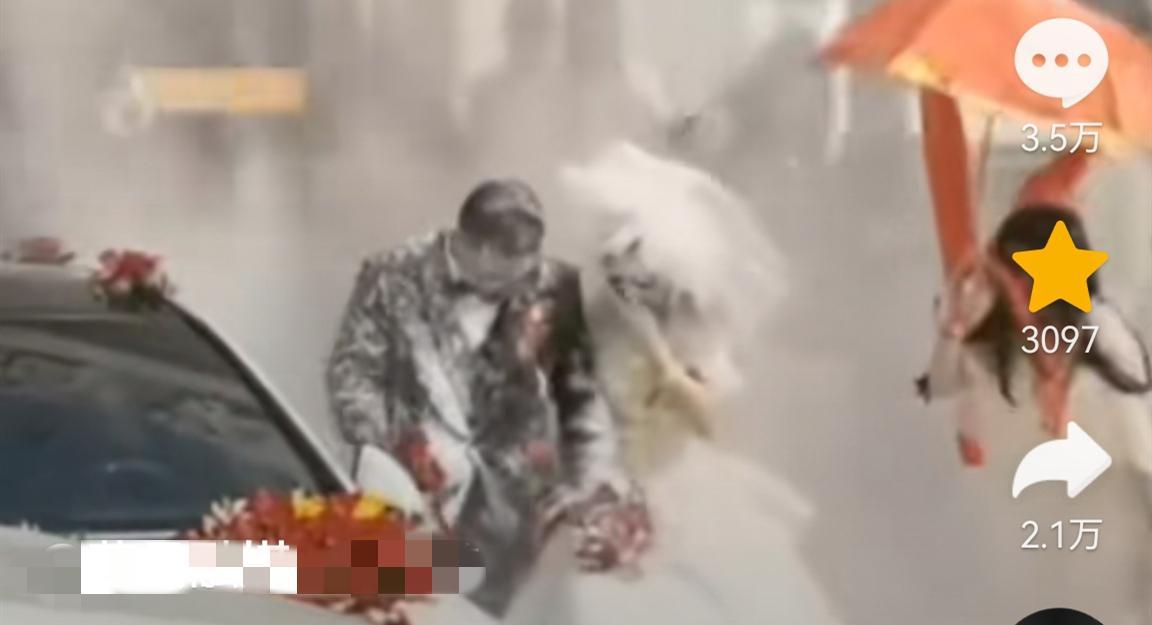 從視頻中可以看到,一對新人攜手走出了酒店,就在他們走向婚車的過程中,突然有人從左邊將一箱麪粉扔向了新人。