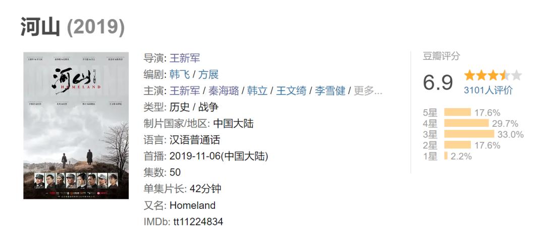 本劇是王新軍的第二部導演作品,上一部已經是5年前的《河山》,豆瓣評分不高,僅有6.9。