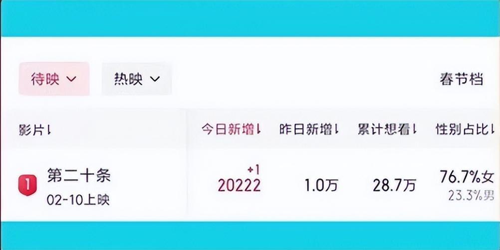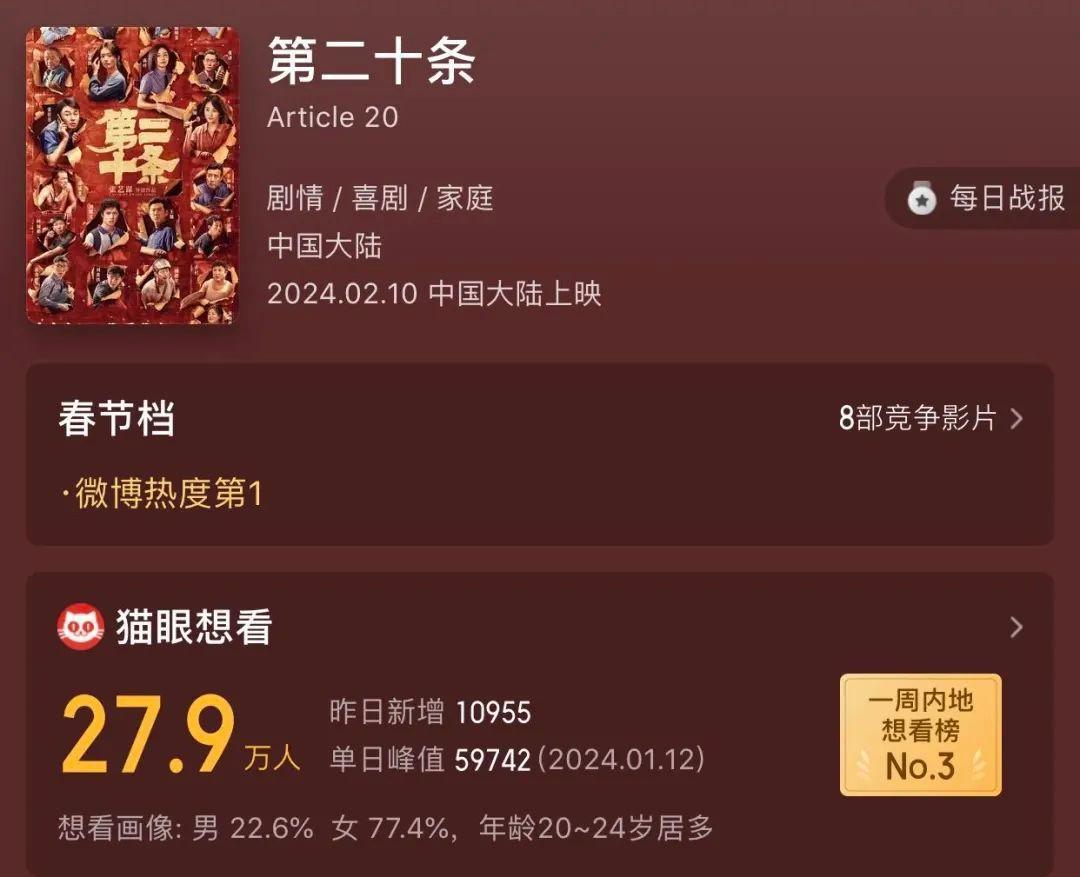 同時根據貓眼專業版的數據顯示,《第二十條》在正式上映前半月,想看人數就超過28萬,真正意義上的萬衆矚目。