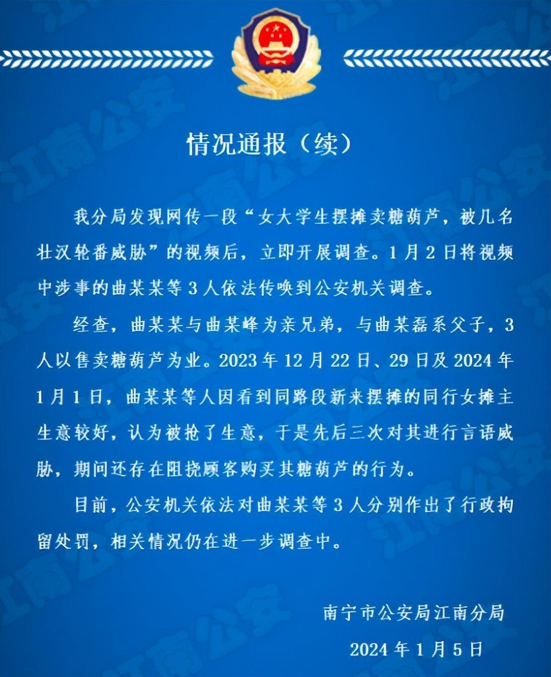 根據警方的調查結果可知,涉事3人彼時認識,兩人爲親兄弟關係,兩人爲父子關係,他們看到同路段的女大學生生意較好,認爲被搶了生意,所以先後三次對該女大學生進行威脅。