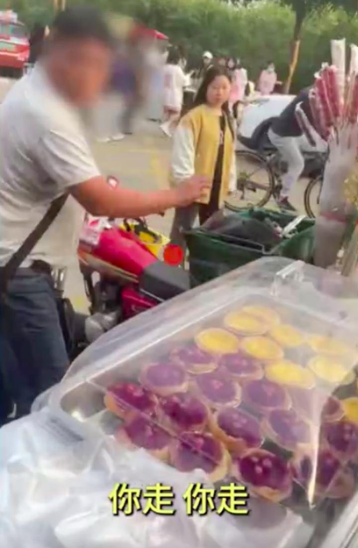 3名男子不僅不讓她擺攤,還讓路人不許買她的糖葫蘆。
