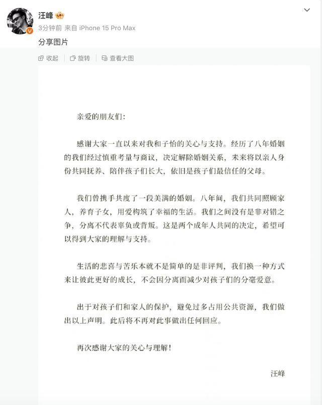 2023年10月23日,汪峯和章子怡一起官宣了離婚的消息。