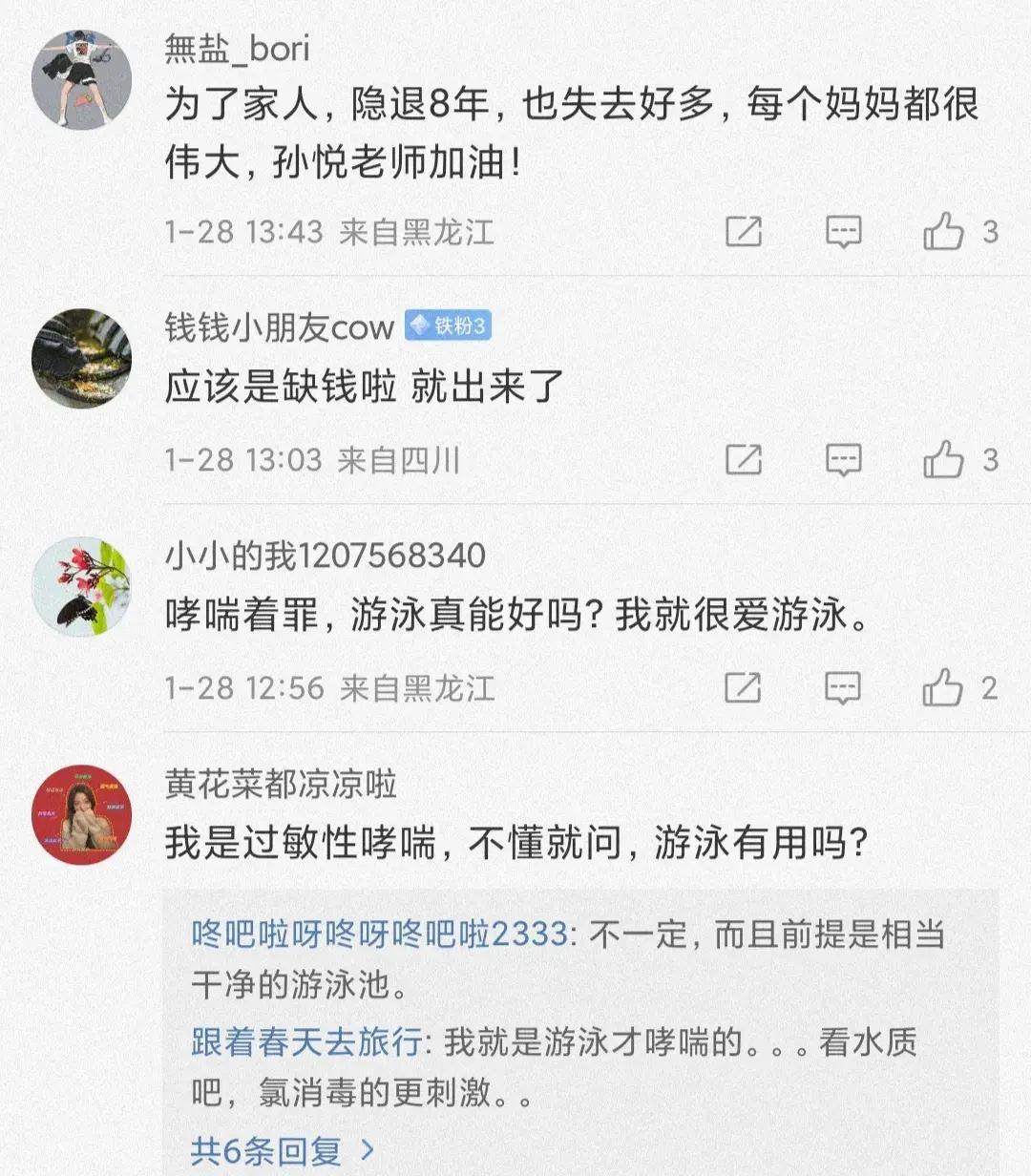 孫悅透露,離開舞臺的8年時間裏,一直都在陪兒子在上海治療哮喘,然而,想盡所有辦法,依然沒有好轉,最後,在醫生的建議下,讓孩子堅持游泳,雖然,過程很艱難,最後哮喘終於好了,身體也挺強壯。