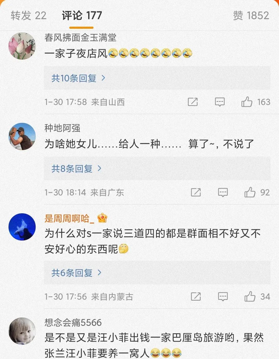 另外,一些網友對小S一家的整體造型忍不住調侃:一家子夜店風,還有上海的一家湊起來纔是一家,不會是汪小菲出錢,讓這一家人到巴厘島旅遊吧。