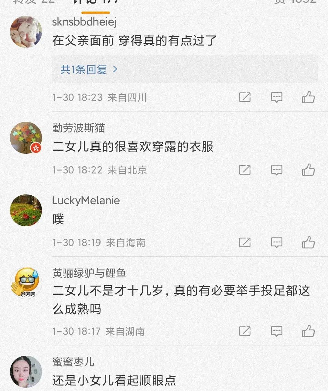 一些網友看到照片,紛紛留言:爲啥她女兒……給人一種…… ,算了,不說了!二女兒才17歲,有必要打扮的這麼成熟?更何況,在父親面前,穿成這樣有點過分了,小S應該管管了。