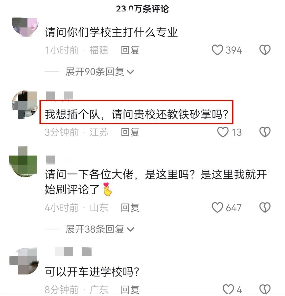 有網友說“請問貴校還教鐵砂掌嗎?”