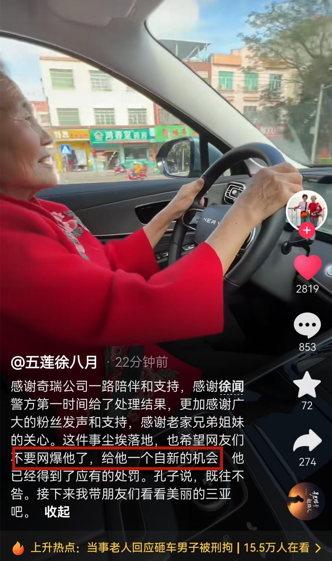對於奔馳男落得這樣的結局,被砸車主也做出了回應,她希望大家不要網暴他,給他一次改過自新的機會。