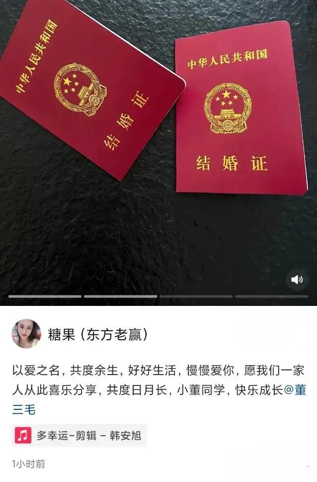 隨後,現任妻子也在社交平臺發文,宣佈結婚喜訊,特意艾特董三毛,還曬出兩人的結婚證,言語中透露着幸福的喜悅。