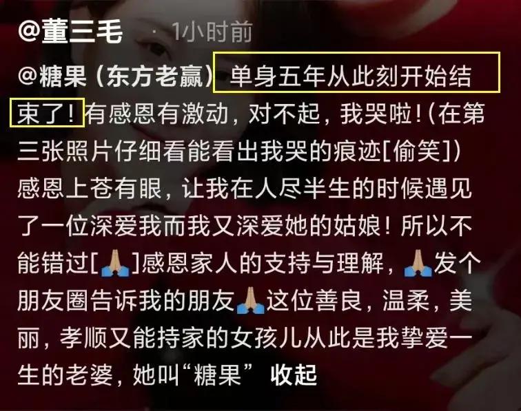 董三毛激動發文,稱單身五年從此刻開始結束,有感恩有激動,讓我在人盡半生的時候遇到一位深愛我的姑娘,就連配的音樂也非常有意義,用了歌曲《緣分讓我認識你》。