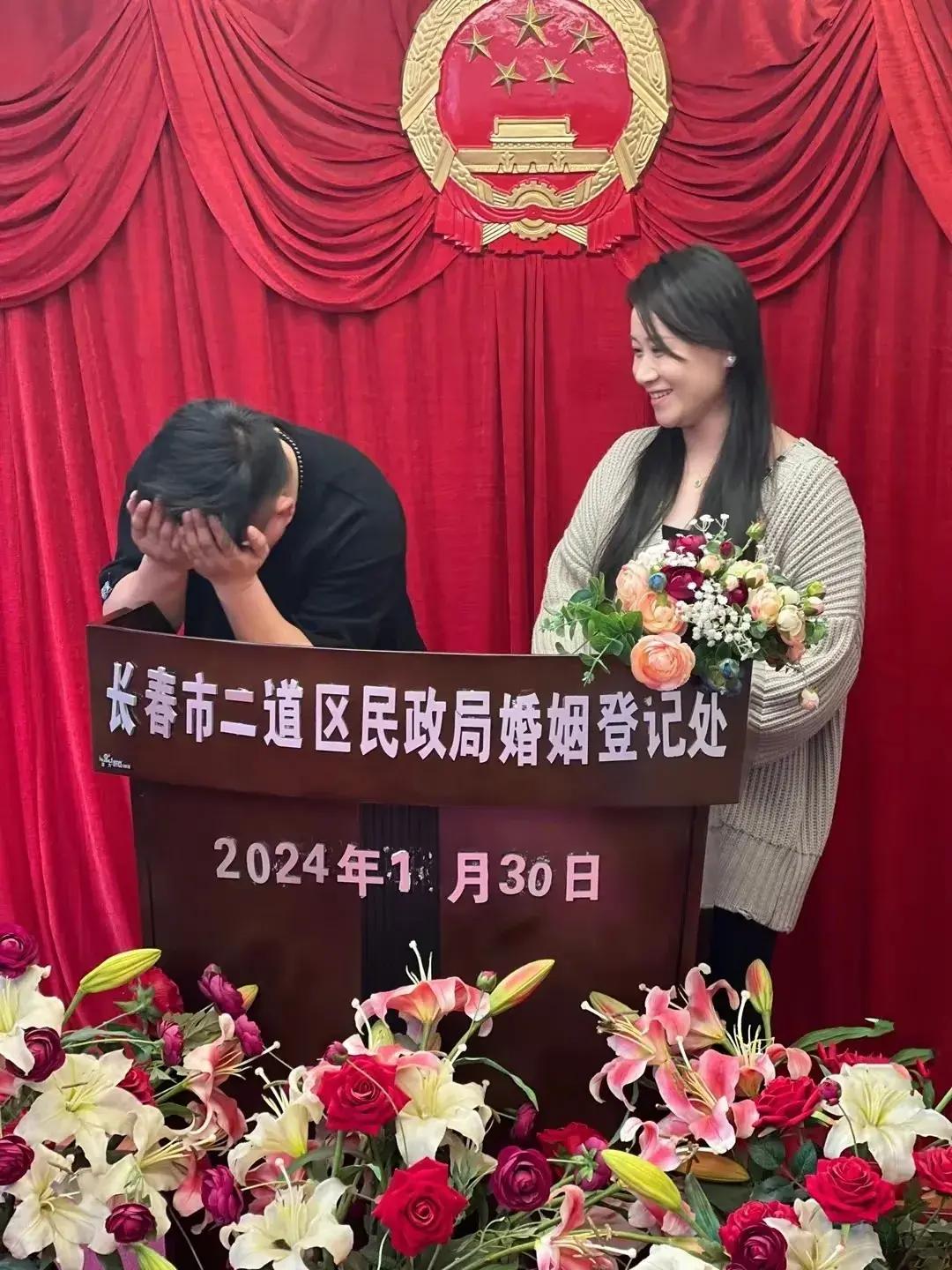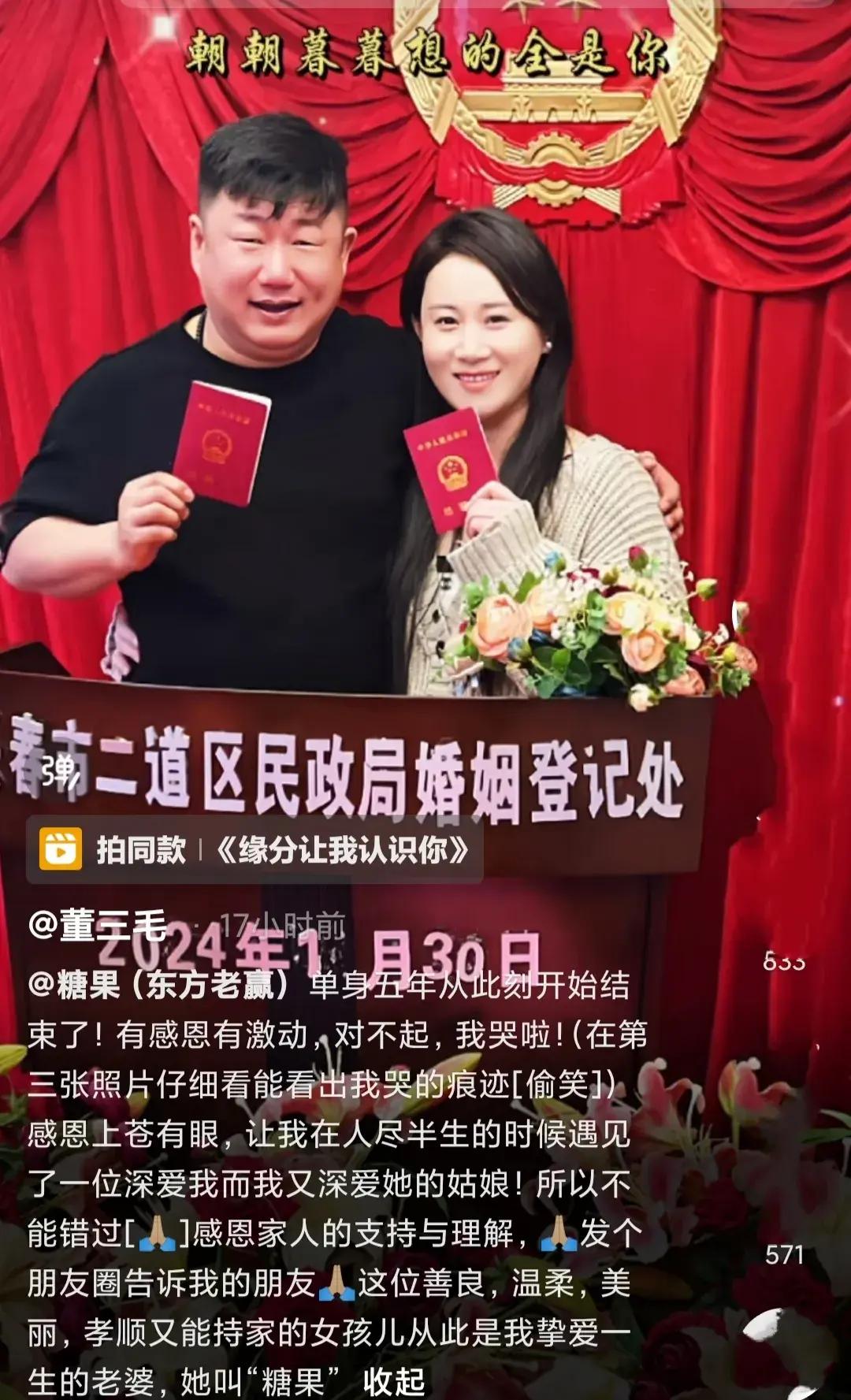 董三毛還曬出與妻子在民政局領證的照片,時間顯示在2024年1月30日,兩人手持結婚證,滿臉幸福的笑容,這麼一看,女方真的是膚白貌美,非常有氣質。