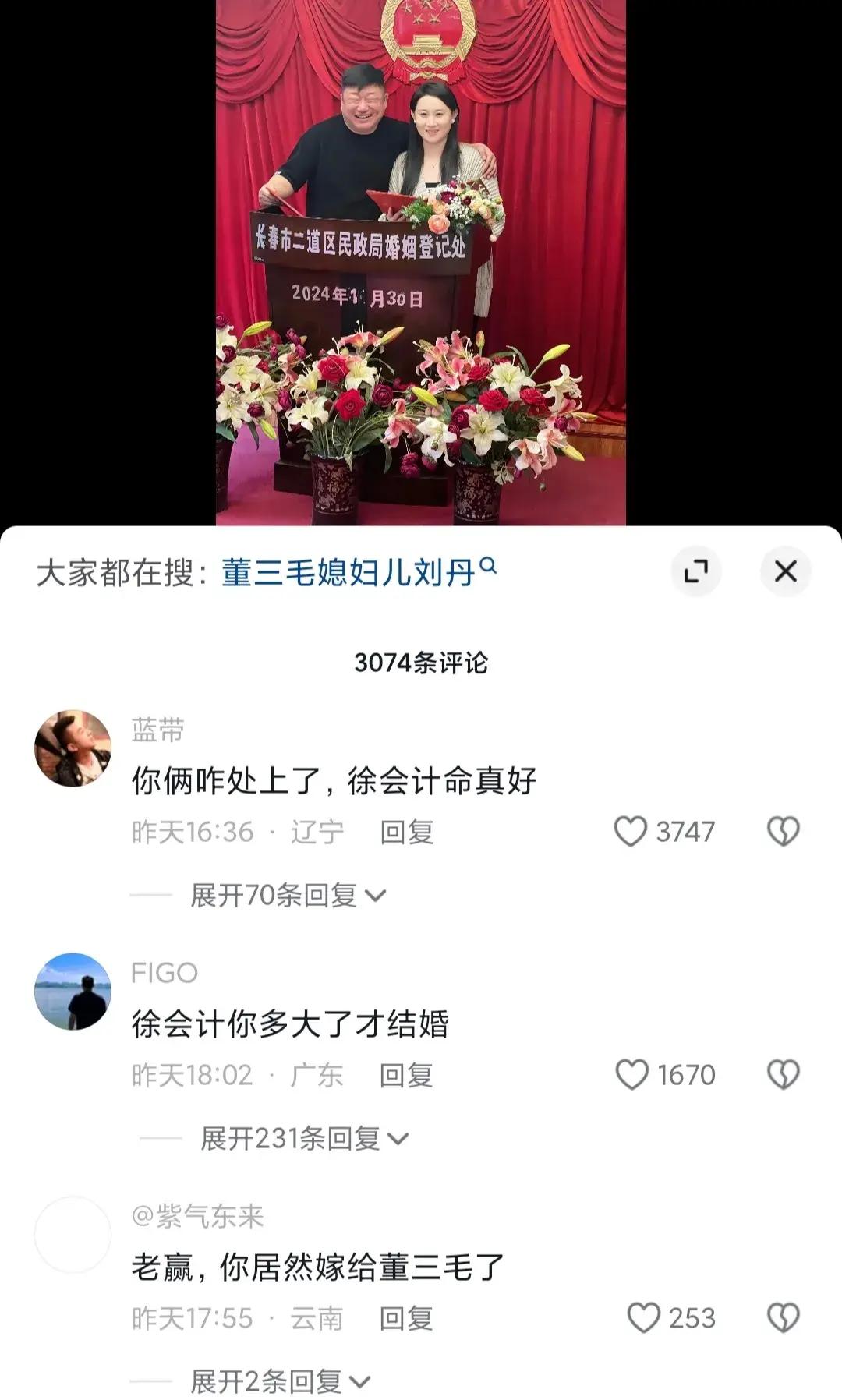 網友們在祝福的同時,也非常疑惑,紛紛留言:啥情況?董三毛的妻子不是劉丹?也是唱二人轉的,照片中的人是誰?這是又結婚了,跟妻子什麼時候離的?