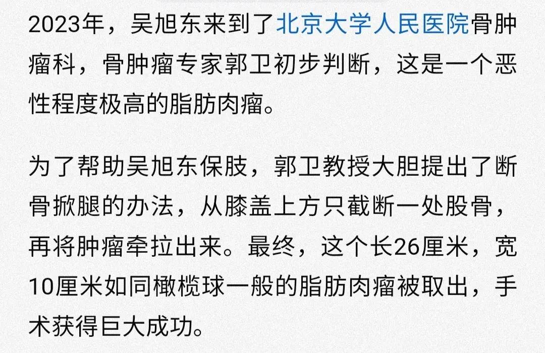 據媒體報道,吳旭東拍戲時感覺腿部疼痛,於是,在2023年到醫院檢查,醫生初步判斷爲惡性程度極高的脂肪肉瘤。