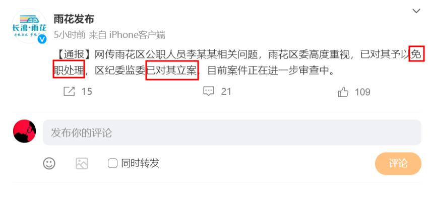 根據通報可知,官方已經對李某萍進行免職處理,區紀委監委已對其立案,目前案件正在進一步審查中。