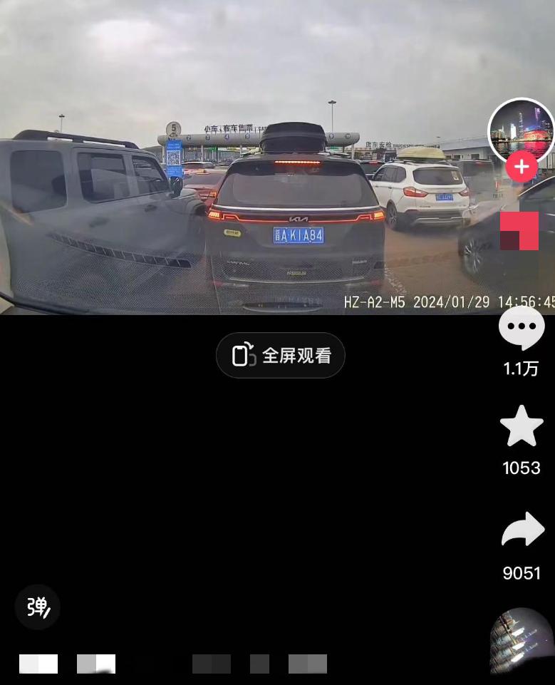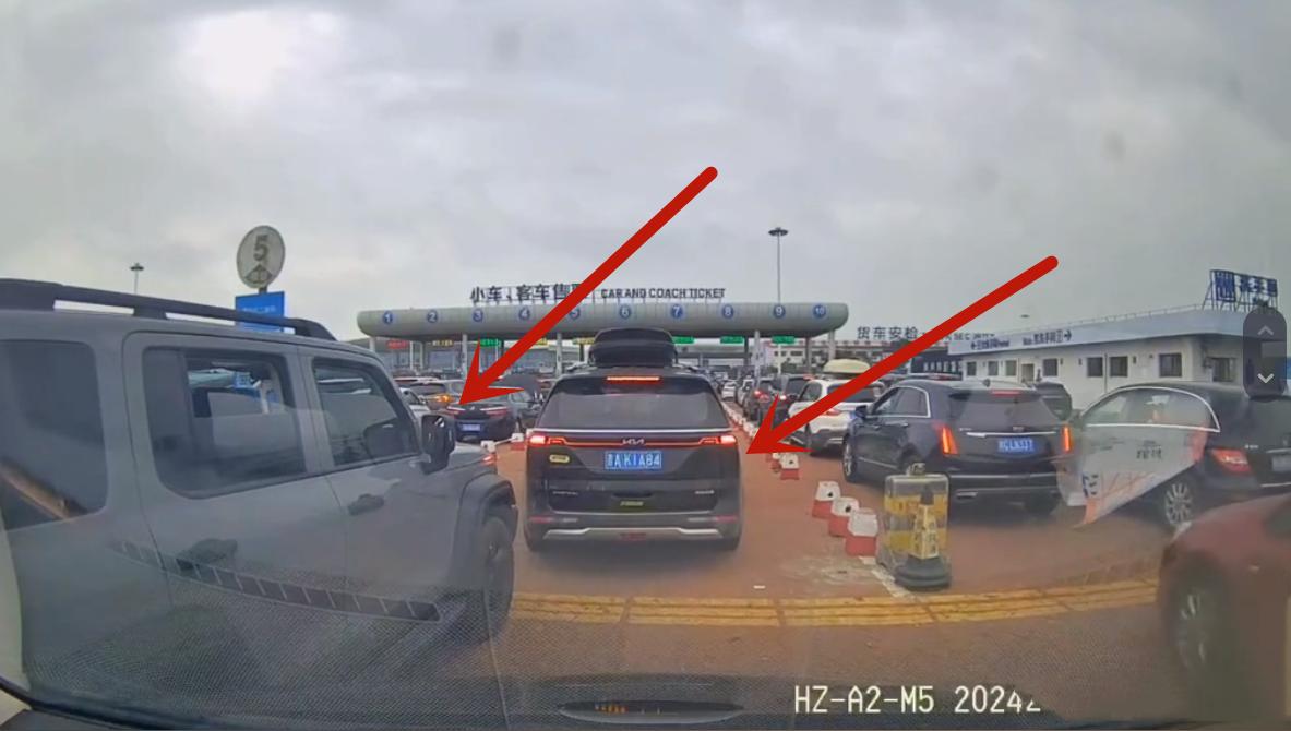 從奔馳商務車的行車記錄儀視頻中可以看到,當時該車所在的入口只有一個售票窗口,兩隊車並排前行,到售票窗口不遠處,兩隊車再變成一隊車,因此兩隊車要交替行駛。