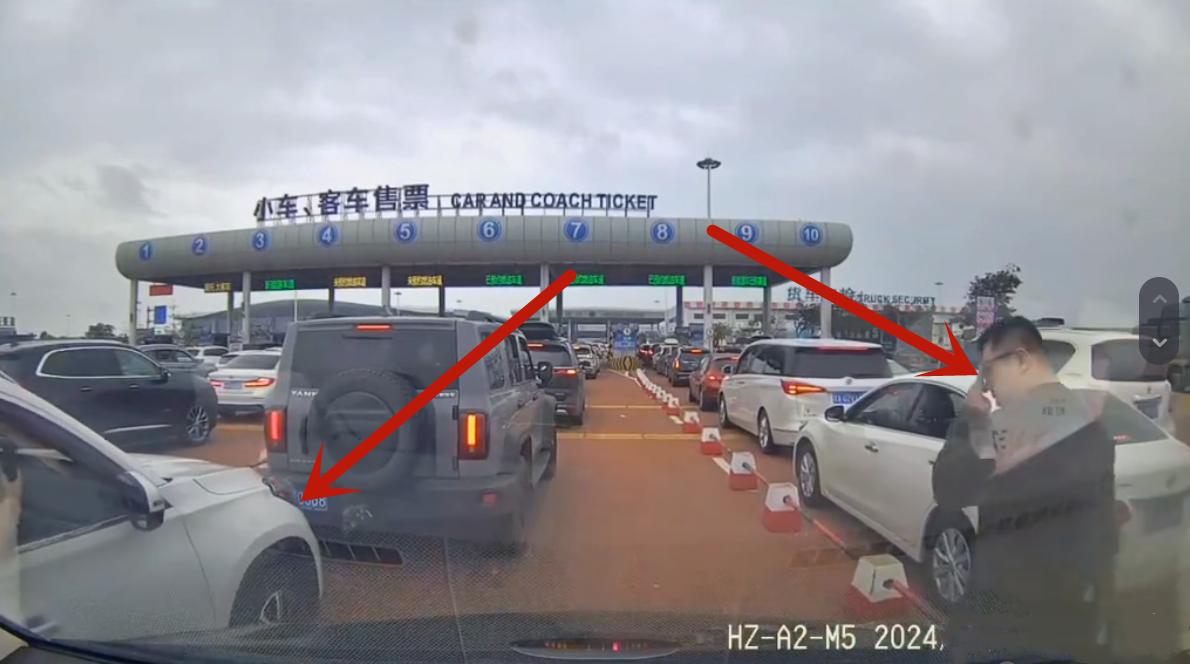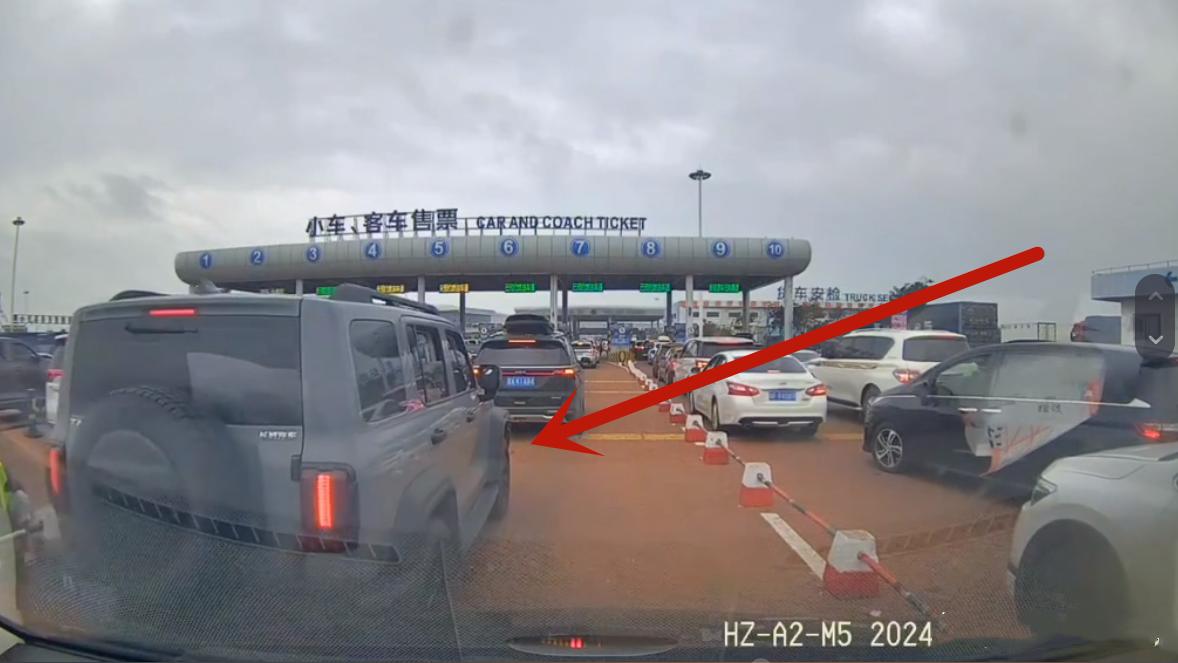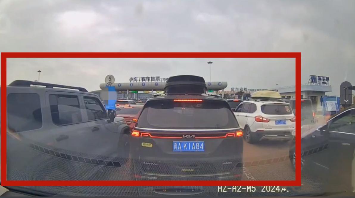從奔馳商務車的行車記錄儀視頻中可以看到,當時該車所在的入口只有一個售票窗口,兩隊車並排前行,到售票窗口不遠處,兩隊車再變成一隊車,因此兩隊車要交替行駛。