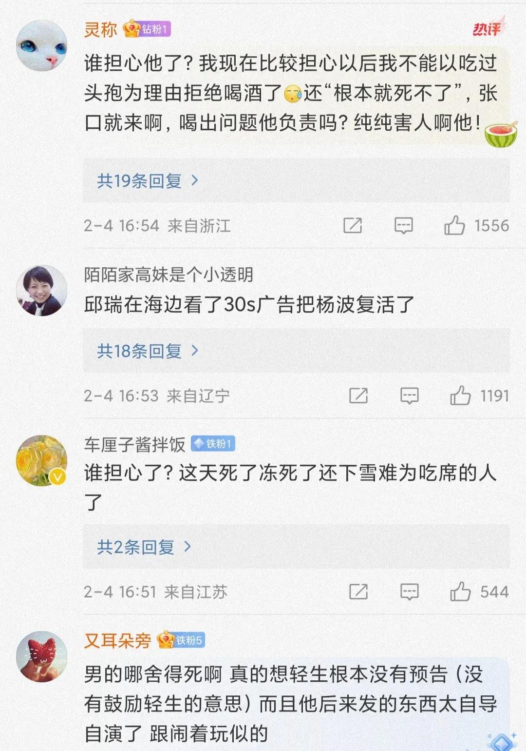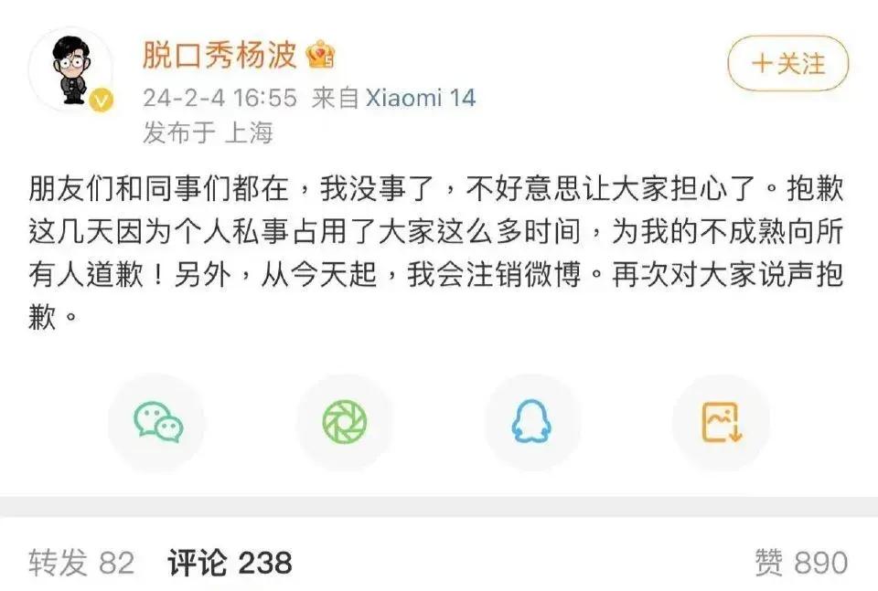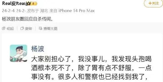 就在大家一頭霧水的時候,楊波在社交平臺發文回應輕生,向大家報平安,透露朋友和同事都在身邊,併爲不成熟的行爲道歉。