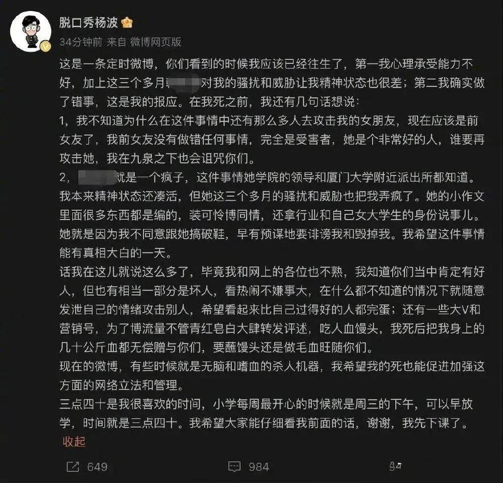 脫口秀楊波回應輕生,爲不成熟道歉,賬號已註銷,女方暗諷戲太多