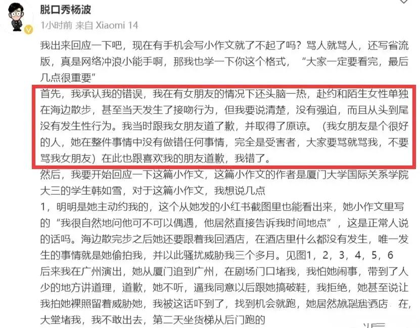 這幾天,脫口秀演員楊波的出軌風波在網上引發熱議,女網友發文爆料,楊波也曬出聊天記錄進行反駁,然而,雙方各執一詞,真假難辨,風波持續發酵,最後,楊波發文回應,然而,大家多數站在女網友這一邊。