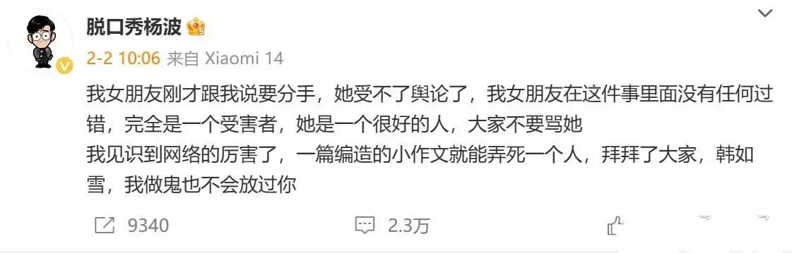 此前,楊波發文談到女友已經提出分手,言語之間充滿憤怒,狀態令人擔憂。