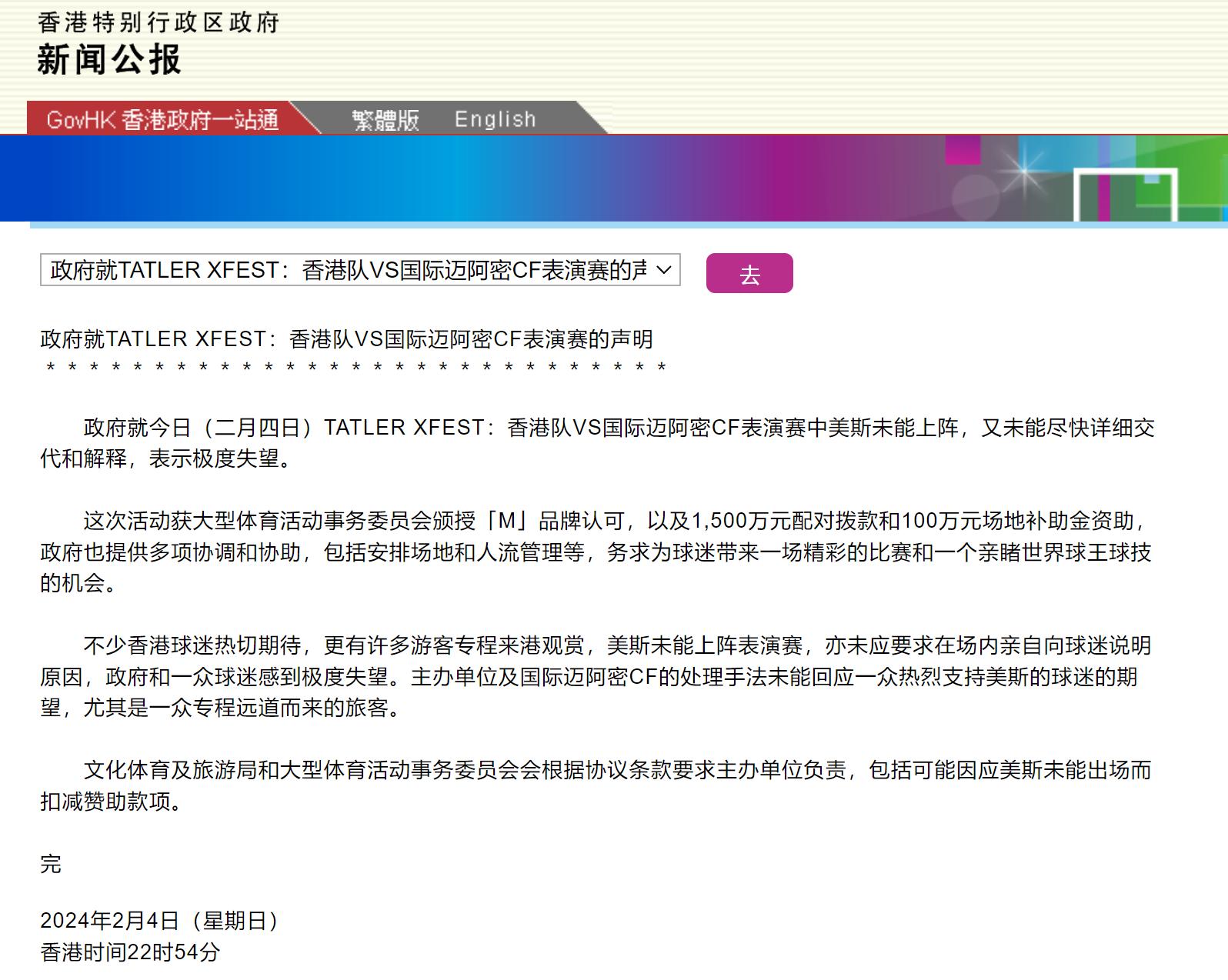 在第二條聲明中,港府則說梅西沒有上場踢球,也沒應要求在場內親自向球迷說明原因,港府和球迷都感到極度失望。