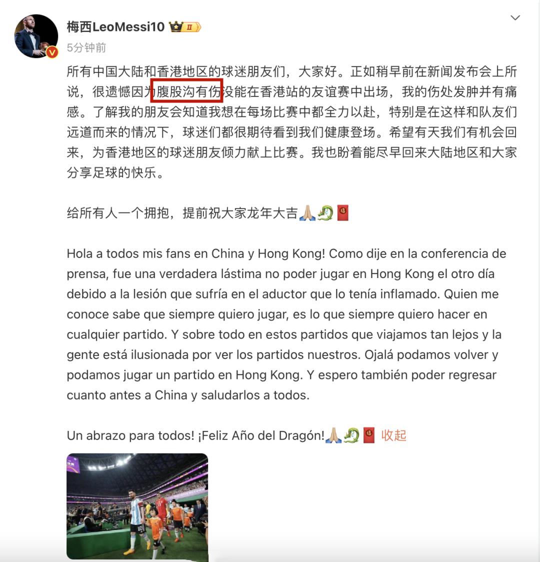 更有意思的,在與日本的友誼賽開始之前,梅西在四川的運營團隊發文對梅西在香港沒有出場比賽做出瞭解釋,給出的理由是腹股溝受傷。