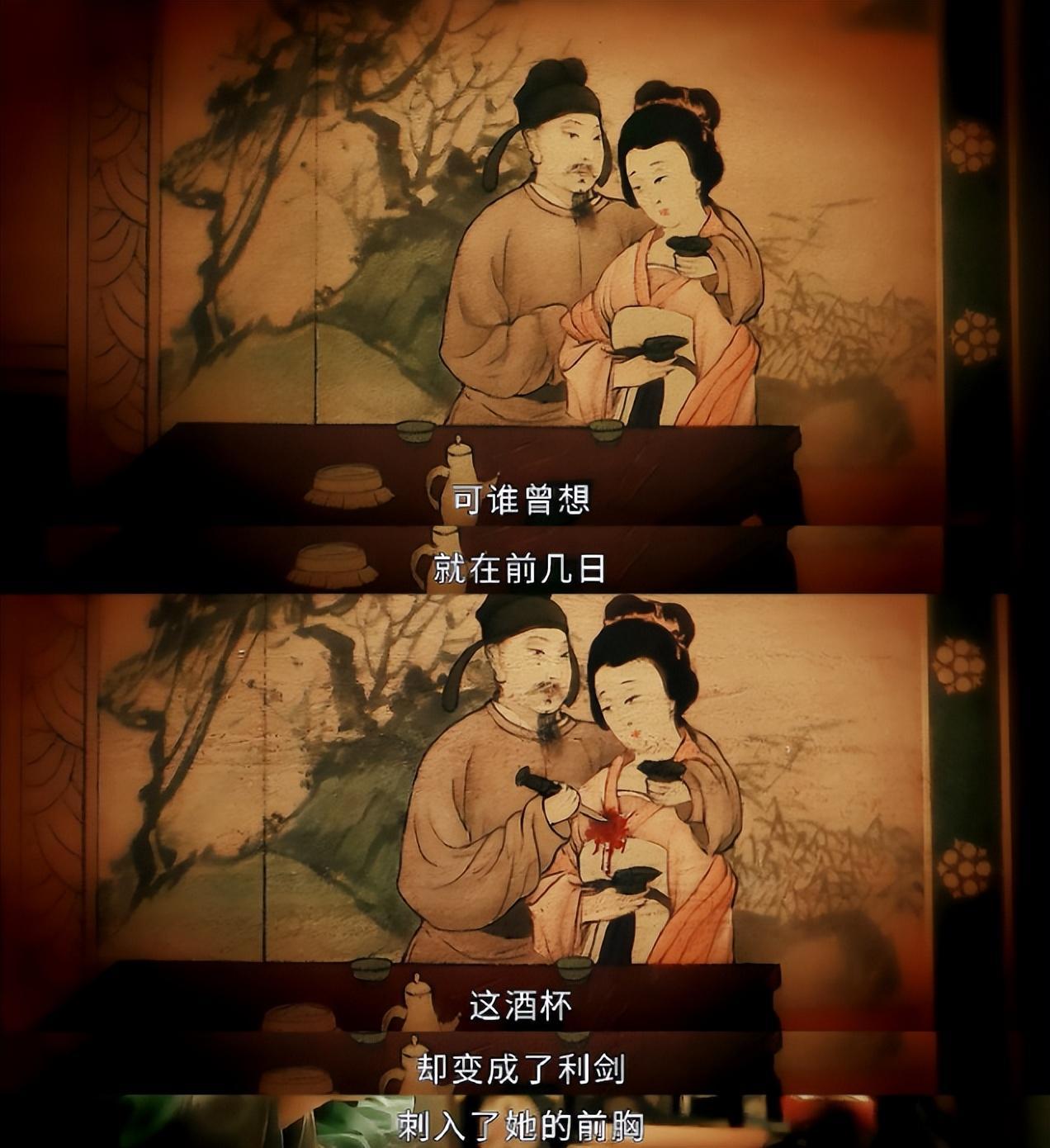 畫上原本是夫妻琴瑟和鳴,現在卻變成了丈夫拿刀殺死妻子。