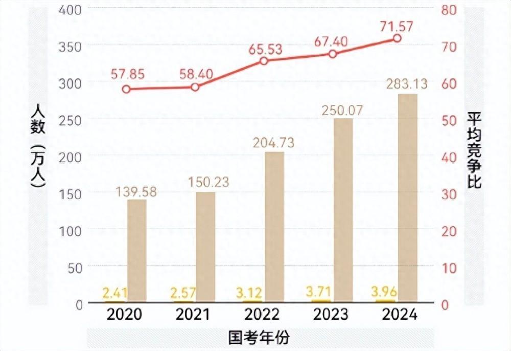 去年年底進行的2024年國考,報名人數對比上一年,暴漲33萬,高達283萬人,創下歷史新高。