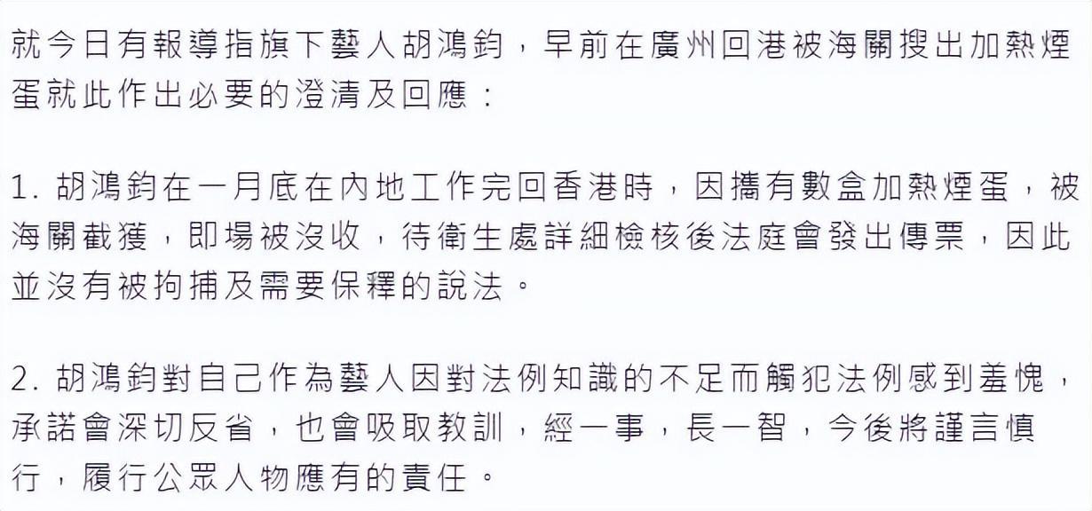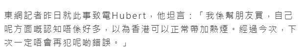 對於胡鴻鈞被逮捕的原因,港媒也進行了披露,港媒“採訪”了胡鴻鈞,胡鴻鈞說他從內地幫朋友買了一些加熱煙帶回香港,他不知道這在香港是違法行爲,他說他對香港對加熱煙的條例認識不足,下次不會再犯這樣的錯誤了。