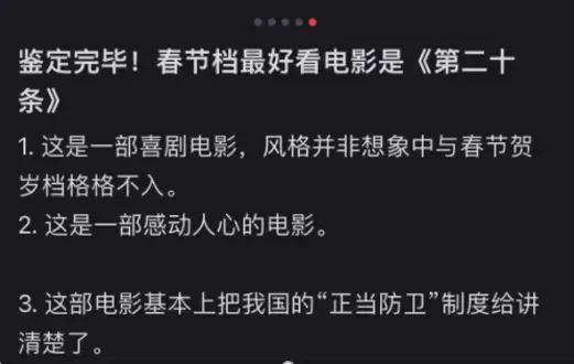 春節檔歷年都是“戰況激烈”,而第一時間看完《第二十條》的觀衆也按捺不住激動,早早到達“戰場”,他們不希望一部電影被埋沒,忍不住對影片瘋狂輸出一頓誇誇!
