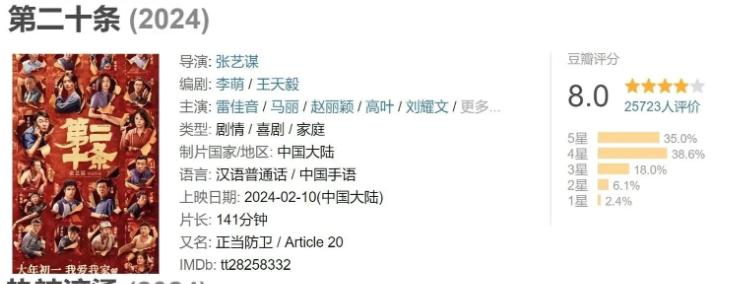 作爲春節檔最受矚目的影片之一,《第二十條》目前票房已經破10億,平臺給出的最終票房預測更是高達20億,8.0的評分也是“聽取誇聲一片”。