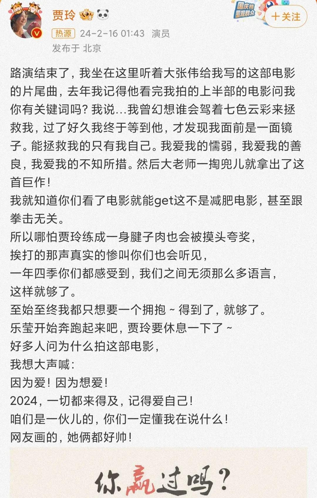 此外,賈玲還特意在社交平臺發文,談到爲何要拍攝這部影片,因爲愛!因爲想愛!這不是一部減肥電影,更與拳擊無關。