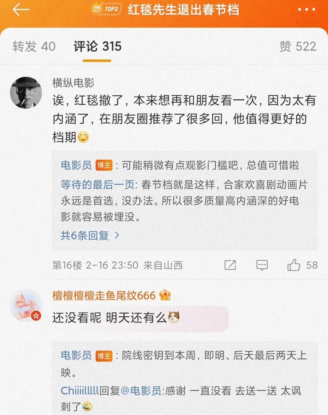 不得不說,這個春節檔好片不斷,競爭也比較激烈,觀衆有了更多選擇性,撤檔未必是壞事,可以選擇更好的時機與大家見面,期待熱映的電影在票房上取得更好的成績。