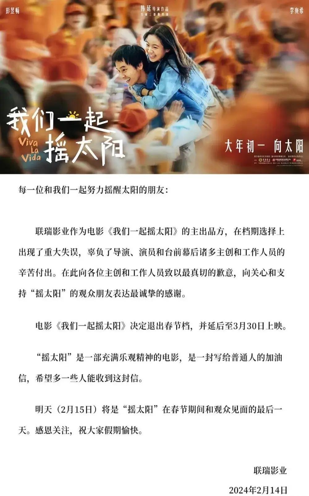 此外,彭昱暢李庚希主演的《我們一起搖太陽》也選擇退出春節檔,延後至3月30日上映。