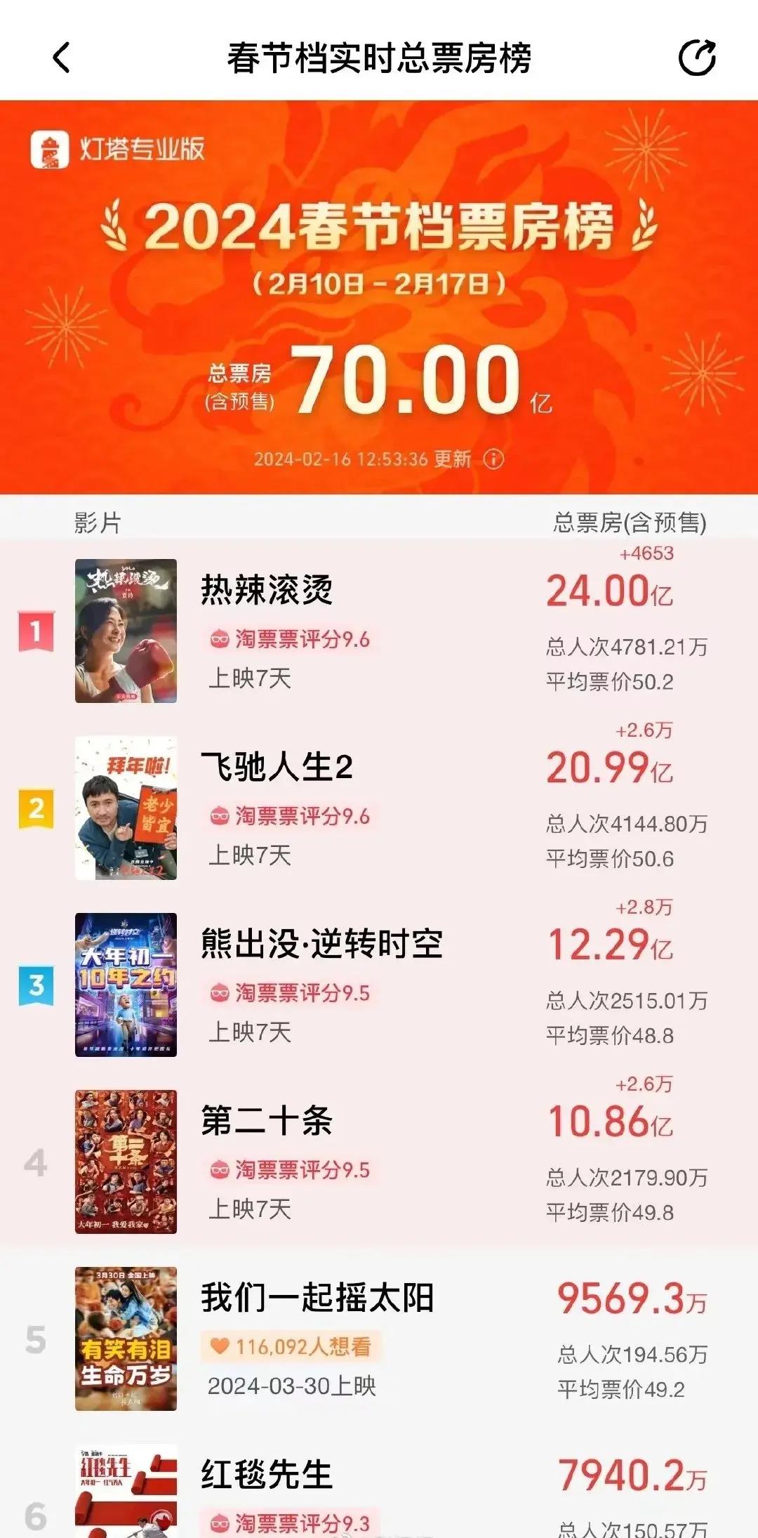 截止2月16日,12點53分,目前,從網上的數據來看,賈玲真的贏麻了,新電影《熱辣滾燙》的票房穩居第一,已經達到24億,這個成績,確實讓人非常驚歎。