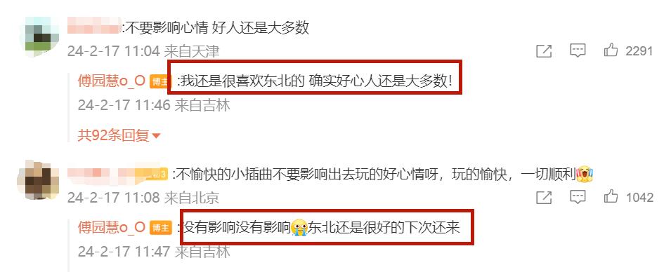 在評論區,她還回復網友說沒有因爲此事影響遊玩的心情,以後還會來東北玩。