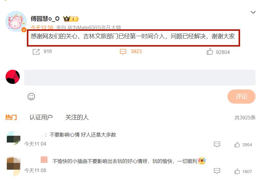 10點56分,傅園慧再次發文,她說感謝網友們的關心,吉林文旅已經第一時間介入此事,“問題已經解決,謝謝大家。”