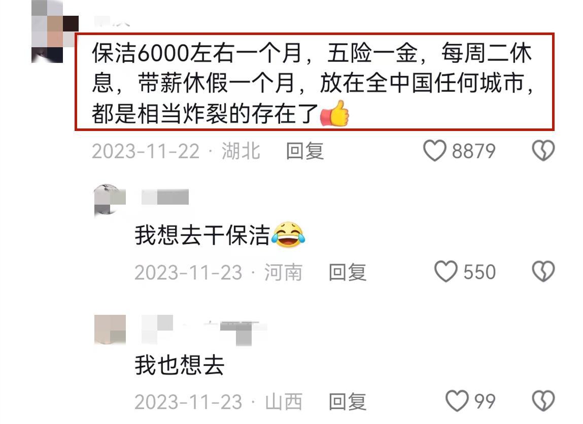 據瞭解,胖東來的保潔一個月工資在6000元左右,有五險一金,像涉事女員工這樣級別的員工,月薪7000多,有五險一金,每週能休息一天,還有一個月年假。