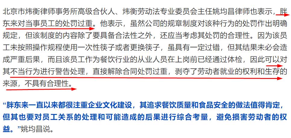 北京的姚律師認爲涉事女員工“雖具有一定過錯,但其結果未必會造成嚴重後果,而且該員工作爲餐飲行業的從業人員在上崗前已經通過體檢,因此可以對其不當行爲進行警告處理,直接解除合同處罰過重,剝奪了勞動者就業的權利和生存的來源,不具有合理性。”