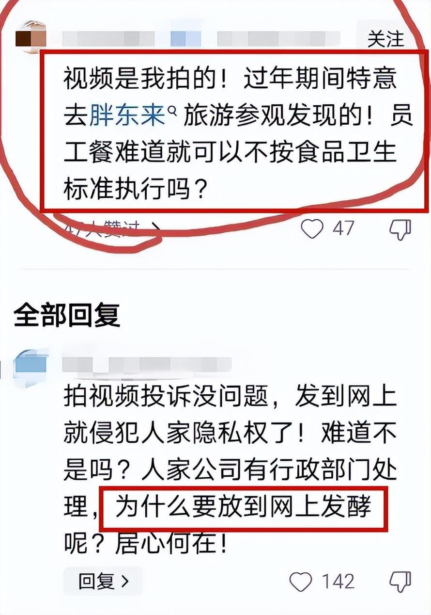 對於網友的指責,一位自稱是拍攝涉事視頻的網友稱視頻是他拍的,他是在胖東來參觀旅遊時發現涉事女員工的這個情況,該網友直言“員工餐難道就可以不按食品衛生標準執行嗎?”